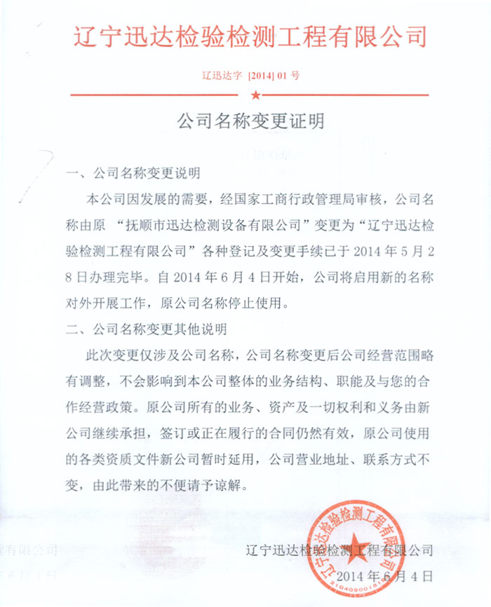 遼寧迅達檢驗檢測工程有限公司名稱變更說明